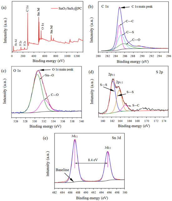 The chemical composition and electronic state of the composite surface were analyzed by XPS. Figure 4a displays the survey spectrum of the SnO2/SnS2@PC composite, confirming the presence of four elements of C, O, S, and Sn. Figure 4b–e display the high-resolution XPS spectra of C 1s, O1s, S 2p, and Sn 3d. The peaks located at a binding energy of 284.8, 285.2, and 286.1 eV in C 1s spectrum (Figure 4b) are attributed to C−C, C−S, and C−O, respectively [31]. The peaks at the energy of 530.5 eV and 532 eV in the O 1s spectrum (Figure 4c) are ascribed to Sn−O−Sn and C−O−Sn bonds, respectively, and validates the valence state of O as −2 [32,33]. Figure 4d represents the deconvoluted S 2p spectrum, where the peak located at a binding energy of 162.1 eV (S 2P3/2) assigns to the S–S bond, the peak at 163.3 eV (S 2P3/2) is specified metal-S bonding, and the peak located at 164.9 eV (S 2P1/2) belongs to the S-C covalent bond [34,35]. The two peaks located at a binding energy of 487.2 eV and 495.6 eV (Figure 4e) belong to Sn 3 d5/2 and Sn 3 d3/2, respectively, and the splitting energy between Sn 3d5/2 and Sn 3d3/2 is 8.4 eV. Such a Sn 3d spectrum designates the Sn4+ state [36]. The results of the XPS analysis demonstrate that both SnO2 and SnS2 were present in the SnO2/SnS2@PC composite, which is consistent with the XRD analysis results.