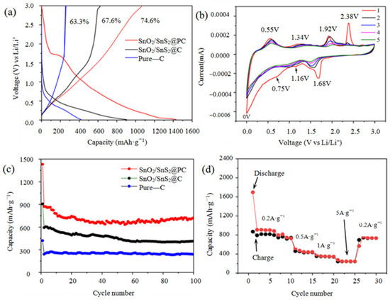 Notably, the initial discharge curve of SnO2/SnS2@PC appears as a distinct platform at ~1.75 V (Figure 5a), which roughly coincides with the average value of the reduction peak potential (1.68 V) and oxidation peak potential (1.92 V) (Figure 5b). In contrast, both the charge and discharge curves of Pure-C electrode are oblique, and no platforms are observed, implying its energy storage mechanism is physical adsorption without any REDOX reactions. For the SnO2/SnS2@C electrode, a sloping plateau ranging from ~1 to 1.5 V appeared in the charging curve, whereas, in the discharge curve, the sloping plateau occurs approximately between ~0.5 and 0.7 V. The possible reason is that the carbon in SnO2/SnS2@C is non-porous, and some SnO2 and SnS2 nanoparticles were encapsulated by non-porous carbon and thus could not participate in the electrochemical reaction. The cyclability performances of the three samples at a current density of 0.2 A·g−1 are displayed in Figure 5c. As shown, with regarded to SnO2/SnS2@PC, the discharge capacity drops from 1431 mAh·g−1 in the first circle to 889 mAh·g−1 in the second circle, then gradually decreases to ~715 mAh·g−1 at the 20th cycle, and then has a slight increase, and keeps steady at 722 mAh·g−1 in the 100th cycle. For the SnO2/SnS2@C, the cycle discharge curve shows a similar trend as SnO2/SnS2@PC, but it only delivers an initial capacity of 905 mAh·g−1, then drops to 598 mAh·g−1 in the second circle and remains at 448 mAh·g−1 in the 100th circle. In contrast, for Pure-C, the discharge capacity falls from 441 mAh·g−1 in the first circle to 240 mAh·g−1 in the second circle and then remains stable until the 100th cycle, exhibiting the best cycle stability among the three samples. This remarkable stability is attributed to the energy storage mechanism of the double-layer capacitor. Different from this type of energy storage mechanism, the SnO2/SnS2@PC exhibits a hybrid energy storage manner of pseudo-capacitance and double-layer capacitor capacitance, which significantly enhances its capacity. Moreover, the largest surface area and highest pore volume of SnO2/SnS2@PC is conducive to uphold the structural strain during repeated lithiation/de-lithiation; that is, the porous carbon can effectively provide a buffer space for the volume expansion of SnO2 and SnS2 particles, enabling them to maintain good structural stability during the cyclic charging/discharging process, thereby exhibiting excellent durability and electrochemical activity compared to the other two materials. Figure 5d shows the rate performance of the SnO2/SnS2@PC anode at different current rates ranging from 0.2 to 5 A·g−1. The average specific capacities are 818, 443, 346, and 245 mAh·g−1 at various current densities of 0.2, 0.5, 1.0, and 5.0 A·g−1, respectively. When the current density again returned to 0.2 A·g−1, the capacity restored to 795 mAh·g−1, showing decent reversibility and stability.