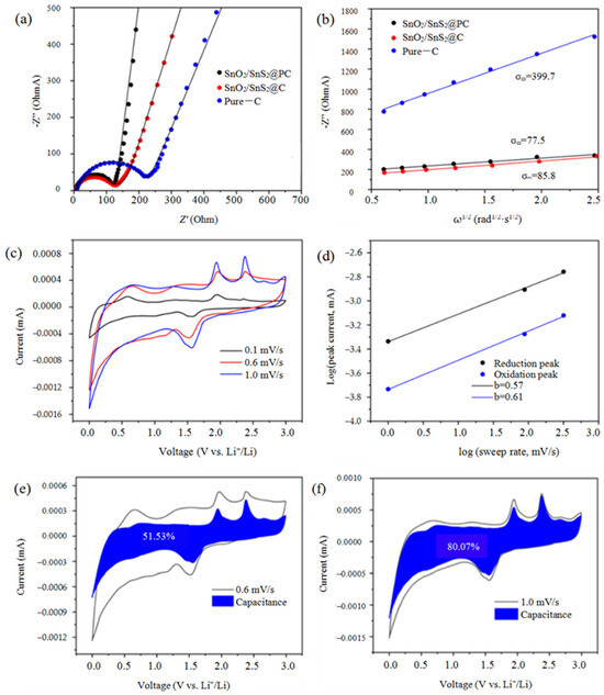 (a) Nyquist diagram and corresponding fitting plots; (b) fitted curves of Z′ vs. ω1/2 at low frequency range; (c) CV curves at different scanning rate; (d) plots of log(i) vs. log(ν); (e,f) capacitance contribution percentages in CV profit at 0.6 and 1.0 mv·s−1 for SnO2/SnS2@PC.