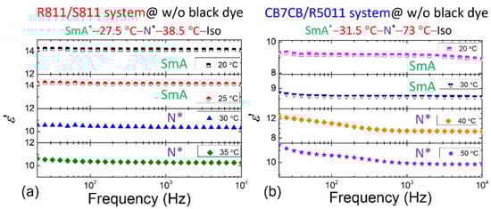 While measuring the phase transition T, dielectric spectroscopy was also conducted for both systems undoped with black dye. The dielectric properties of the R811/S811 system in the SmA* and N* phases are depicted in Figure 4a. Noticeably, within the measured frequency range, both phases exhibit nearly constant permittivity, with no discernible dielectric relaxation. In contrast, Figure 4b presents the results for the CB7CB/R5011 system, where the SmA* phase similarly shows no dielectric relaxation, but the N* phase displays pronounced dielectric relaxation behavior. Comparative analysis reveals that such relaxation behavior is exclusive to the CB7CB/R5011 system at elevated T, suggesting it is a distinctive feature of CB7CB’s flexoelectric polarization [,,]. Moreover, the relaxation shifts toward higher frequencies as T increases.