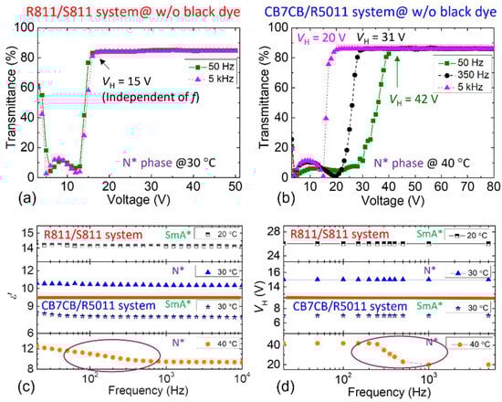 V–T% curves of (a) the R811/S811 and (b) CB7CB/R5011 systems at various frequencies. (c) Real-part dielectric spectra and (d) frequency-dependent VH of SmA* and N* phases for the R811/S811 and CB7CB/R5011 systems. The nematic host of these CLC samples is E7.