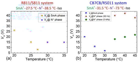 Figure 7a,b present VH variation with T for the R811/S811 and CB7CB/R5011 systems, respectively. In the R811/S811 system, VH of 8 Vrms at 27 °C (near the SmA*–N* phase transition T) is notably lower than that at 30 °C (VH = 15 Vrms), likely due to changes in the order parameter. A similar trend is monitored in the CB7CB/R5011 system (Figure 7b). However, previous results indicate that VH in the N* phase of the CB7CB/R5011 system is frequency-dependent. Thus, VH was measured simultaneously at two frequencies: 50 Hz and 5 kHz. This study emphasizes the distinct VH values near the SmA*–N* phase transition, attributed to order parameter variation, to permit switching between the SmA*–H and N*-FC states.