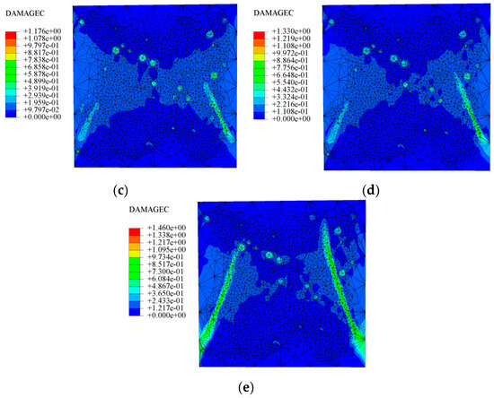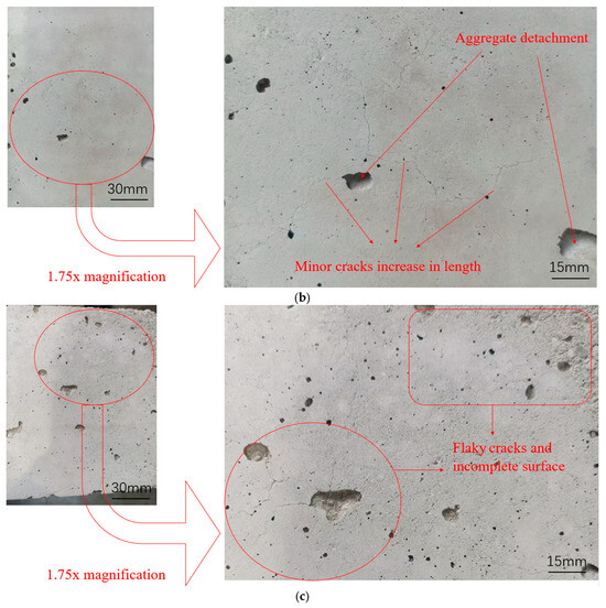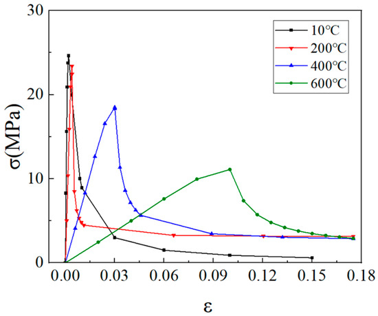 Figure 12b for each temperature, also exhibits a positive inversion connecting the tetragonal cone. Observing the specimens’ final damage morphology, it is evident that with increasing temperature, CB aggregates are not gradually sheared; instead, internal cracks within the specimens progressively increase, and the mortar structure becomes loose.