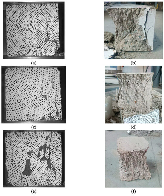 Figure 12f damage morphology, where most of the mortar is crushed into powder. At this stage, the strength-determining factors of LWC-CB are no longer solely CB aggregates but also depend on mortar strength and interfacial adhesion.