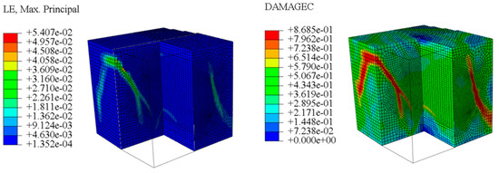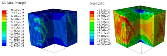 fcT, since the tensile strength of concrete itself is much lower than its compressive strength, with increasing load, transverse deformation occurs due to the Poisson effect. This deformation is constrained by the surrounding concrete, generating transverse tensile stresses. When this tensile stress exceeds the tensile strength of concrete, the specimen develops cracks. As shown in the figures, the transverse strain increases sharply to 7067.3 με, corresponding to a longitudinal strain region of −1920.4 με. The strain concentration zones in the transverse strain contour plot form through-cracks across the specimen as the load increases. The crack initiation process is consistent with that captured by DIC equipment in studies by Jinna Shi [