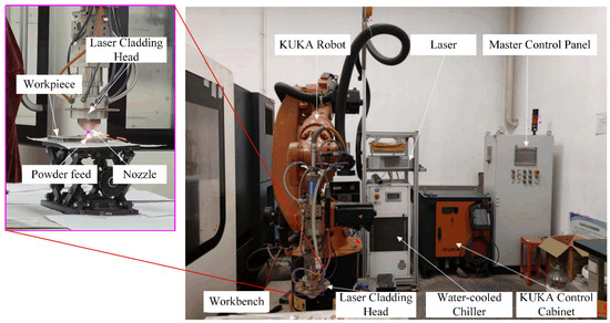 The experimental setup is illustrated in Figure 1. It comprises a six-degree-of-freedom KUKA robot (KUKA Robotics, Augsburg, Germany), an electrical control cabinet (Zhongke Raycham Laser Tech, Nanjing, China), a fiber laser (IPG Photonics, Oxford, MA, America), a powder feeder (Zhongke Raycham Laser Tech, Nanjing, China), water-cooling equipment(Zhongke Raycham Laser Tech, Nanjing, China), and protective devices (Zhongke Raycham Laser Tech, Nanjing, China) that work in coordination to complete the laser cladding process. The laser beam center emitted by the laser and the powder delivery center from the powder feeder are aligned at the same point in three-dimensional space. The terminal sections of the powder delivery line and the shielding gas line are fixed to the end effector of the KUKA robot.