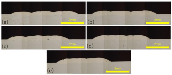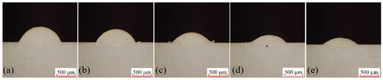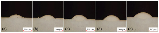 Single-factor experiment on scanning speed and molten pool cross-section, (a) 3 mm/s; (b) 4 mm/s; (c) 5 mm/s; (d) 6 mm/s; (e) 7 mm/s.