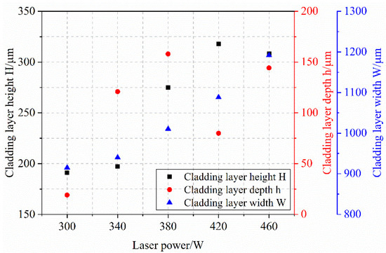 In the laser cladding experiments, the laser power P is one of the most critical process parameters, directly affecting the quality of the clad layer. By conducting a single-factor experiment on laser power, we can preliminarily verify whether the selected power range effectively melts both the cladding powder and the substrate material, laying the groundwork for subsequent orthogonal experiments. Based on equipment parameters, a single-factor laser power experiment was conducted with five levels: 300 W, 340 W, 380 W, 420 W, and 460 W. The cross-section of the clad layer from this single-factor laser power experiment is shown in Figure 4. Measurements of the cladding layer interface under different laser powers yielded the fusion height H, fusion depth h, and fusion width W. Further calculations based on the aspect ratio and dilution rate formulas described above produced the molten pool data for each laser power.