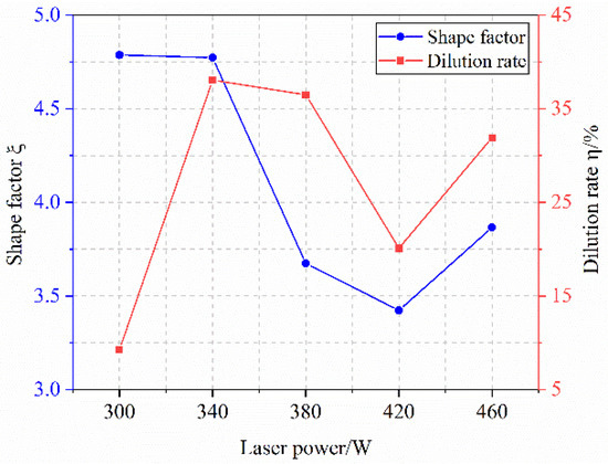 As laser power varies, corresponding changes are observed in both the shape factor and dilution rate. The shape factor initially decreases and then increases with higher laser power. At lower powers (300 W and 400 W), insufficient energy leads to more powder melting than substrate melting, causing the molten powder to adhere to the surface with negligible penetration, as illustrated in Figure 4a. In contrast, at 460 W, elevated surface temperature enhances fluidity, resulting in a larger shape factor. The dilution ratio first increases and then decreases overall with laser power. Due to the coaxial powder feeding method, penetration depth remains nearly constant beyond 340 W (around 130 μm), while the weld height continues to rise. This leads to a stable numerator but a growing denominator in the dilution formula, thereby reducing the dilution ratio.