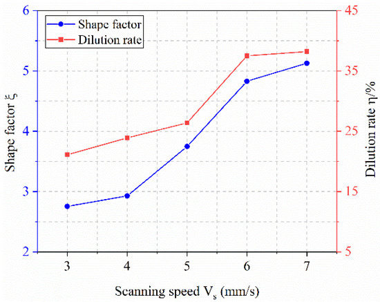 As shown in Figure 9, the shape factor increases gradually with scanning speed. This trend arises because the scanning speed influences melt height more significantly than melt width. Specifically, the melt height decreases markedly with increasing speed, while the melt width exhibits a comparatively smaller change. As a result, the numerator (melt height) in the shape factor expression decreases less than the denominator (melt width), leading to an overall increase in the shape factor. The dilution rate also rises with increasing scanning speed. Although the penetration depth remains relatively stable under higher speeds, the melt height decreases considerably. This reduction in melt height causes the denominator in the dilution rate formula to decrease, thereby increasing the dilution rate.