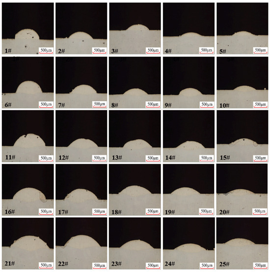 The three factors most significantly influencing laser cladding quality are laser power, scanning speed, and powder feed rate. An orthogonal experimental design was conducted for these three factors, with five levels set for each factor. Test specimens were processed to obtain their cross-sectional morphology. Based on the cross-sectional results, the melt height, penetration depth, and width of the melt pool were measured. Further calculations yielded the shape factor and dilution rate. The orthogonal experimental design and measured data are shown in Table 7, while the cross-sectional morphology is depicted in Figure 13.
