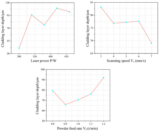 The experimental effect curve for cladding depth h is shown in Figure 15. Overall, the cladding depth (h) exhibits a gradual increase with rising laser power. Higher laser power delivers more energy to the molten pool. While part of this energy melts additional powder—increasing pool height and width—another portion penetrates deeper into the substrate, resulting in greater penetration depth. In contrast, penetration depth generally decreases with increasing scanning speed, which reduces the energy input per unit area and thus limits substrate melting. The relationship between powder feed rate and penetration depth is more complex, showing an initial decrease followed by an increase. At lower feed rates, more ejected powder partially shields the substrate from direct laser irradiation, reducing the penetration depth. As the feed rate further increases, however, a larger volume of melted powder contributes to the molten pool. During subsequent cooling, heat is transferred downward into the substrate, promoting additional melting and consequently increasing the penetration depth.