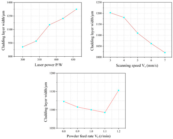 Figure 16 illustrates the experimental results for the clad layer width (W). The cladding width increases gradually with laser power, as higher power provides more energy to the melt pool. This enhances powder melting and enlarges the pool’s cross-sectional area. Moreover, improved metal fluidity due to complete melting promotes outward spreading, further widening the clad layer. In contrast, the melt width decreases with increasing scanning speed. This trend is attributed to the reduction in energy input per unit area, which can lead to incomplete powder melting and accumulation over the pool, constraining width expansion. Additionally, the decreased powder mass per unit area at higher speeds contributes to a narrower deposition profile. The relationship between powder feed rate and melt width is non-monotonic, showing an initial decrease followed by an increase. At lower feed rates, insufficient melting causes partially melted powder to accumulate above the pool, reducing effective width. However, at a feed rate of 1.2 r/min, the melt width increases abruptly, likely due to excessive powder accumulation deteriorating cladding quality, where inadequate laser melting leads to irregular powder stacking and apparent width expansion.