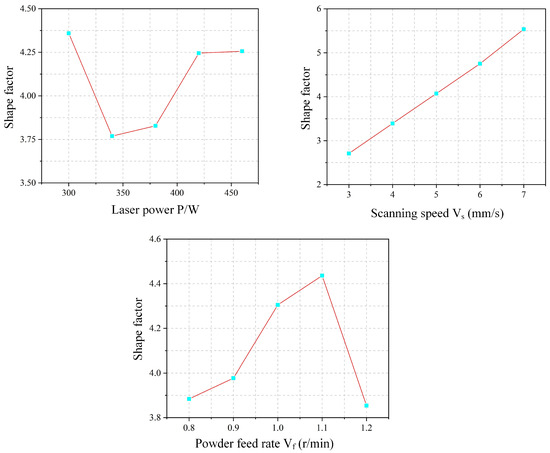 The experimental effect curve of the shape factor ξ is shown in Figure 17. As laser power increases, the shape factor initially decreases and then increases. At lower power levels, incomplete powder melting leads to accumulation above the melt pool, significantly increasing the melt height with little change in width, thereby reducing the shape factor. As power further increases, complete melting results in a flatter pool morphology, raising the shape factor. The shape factor increases linearly with scanning speed. Higher speeds reduce the powder mass per unit area, lowering the clad height, while the melt width remains relatively stable. This consistent height reduction under nearly constant width leads to the linear rise in the shape factor. With increasing powder feed rate, the shape factor first increases and then drops sharply. At moderate feed rates, sufficient energy enables complete melting, widening the pool and raising the shape factor. However, at 1.2 r/min, inadequate laser energy leads to incomplete melting and powder accumulation above the pool, causing a sharp decrease in the shape factor.