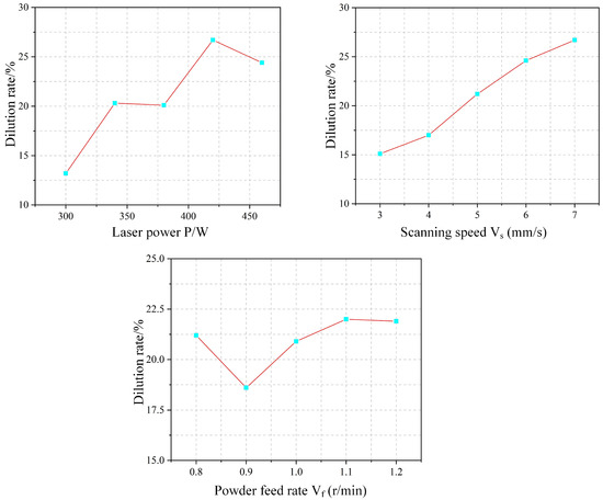 The experimental effect curve of the dilution rate is shown in Figure 18. The dilution rate generally increases with laser power, as higher power introduces more energy into the melt pool, enhancing penetration depth and thus raising dilution. With increasing scan speed, the dilution rate also gradually rises. This is because higher speeds reduce both the powder mass per unit area and the laser energy input, allowing more energy to be directed toward substrate melting, which increases penetration depth and thereby dilution. In contrast, the dilution rate remains largely stable as the powder feed rate increases. Although more powder elevates the clad height, the associated heat dissipation leads to deeper substrate melting. The resulting simultaneous increase in both penetration depth and clad height maintains a nearly constant dilution rate.