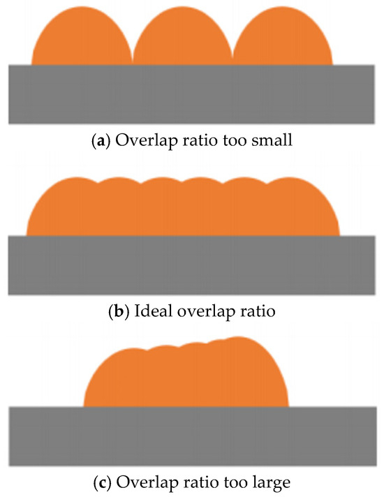 In practical applications, multiple passes are performed to form a larger cladding layer for coating or repair purposes. This requires overlapping individual cladding passes to achieve a better cladding surface. The overlap ratio reflects the proportion of lateral overlap between adjacent cladding layers, defined as the ratio of overlap width to single cladding pass width, expressed as a percentage [40,41]. Its calculation formula is shown in Equation (11):