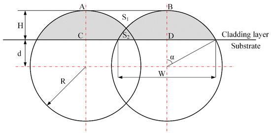 Calculating the overlap ratio involves area computations, and since the shape of the molten pool above the substrate is irregular, the calculation presents significant challenges. Therefore, the upper portion of the molten pool is idealized as a segment of a circle, with the ideal overlap model shown in Figure 20. The principle is that the overlapping area S2 of a single cladding layer during overlap equals the gap area S1 between two single layers, ultimately ensuring a flat upper surface of the overlap. Therefore, it is necessary to calculate the sizes of S1 and S2 to ensure they are equal.
