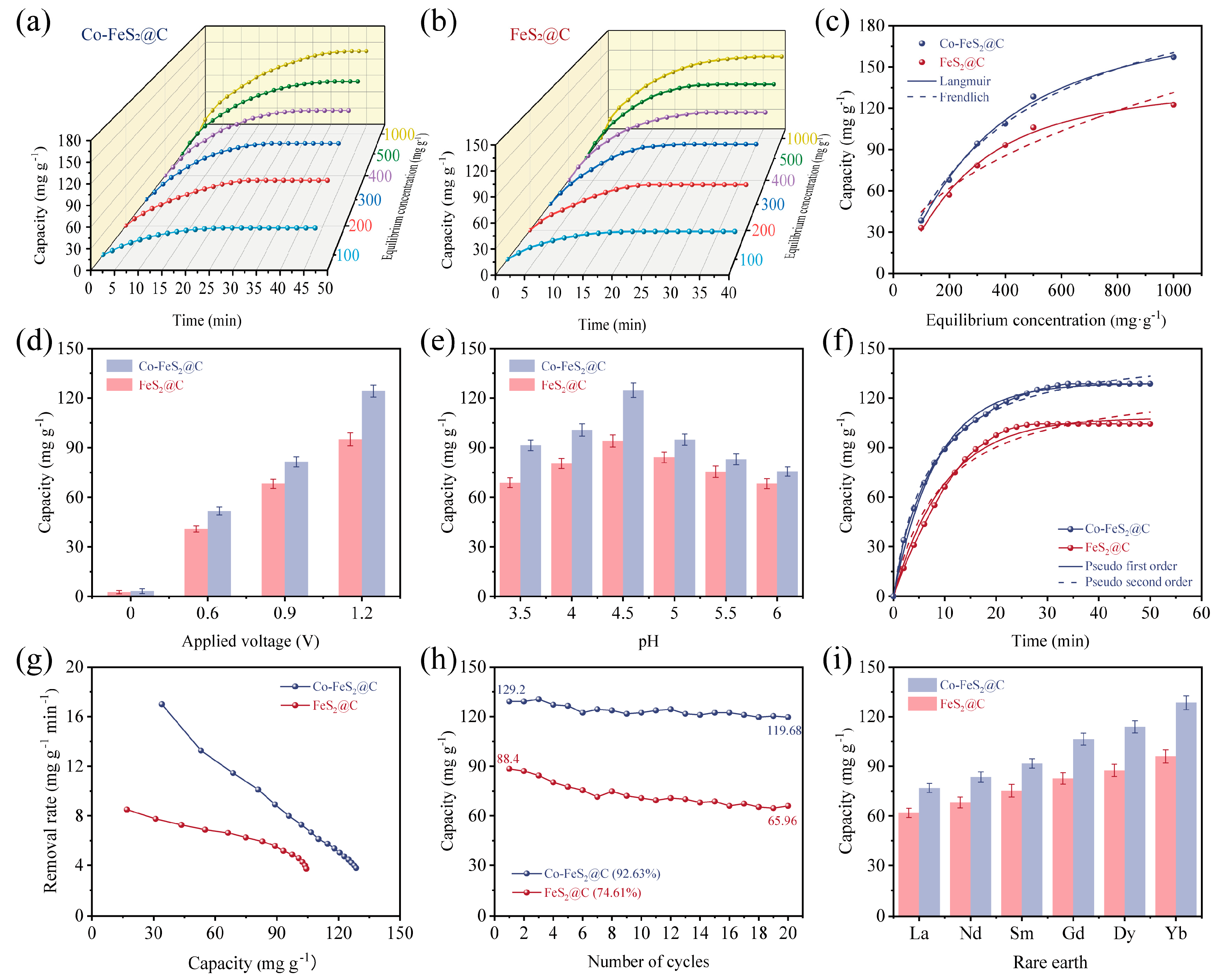 - Ji, Y.; Sun, C.; Bi, K.; Tian, H.; Zhang, Y. Fabrication of Fe-CoS2@N-doped C electrode for highly efficient and durable electrosorption of Yb(III) from aqueous solutions. Sep. Purif. Technol. 2024, 341, 126912. [Google Scholar] [CrossRef]