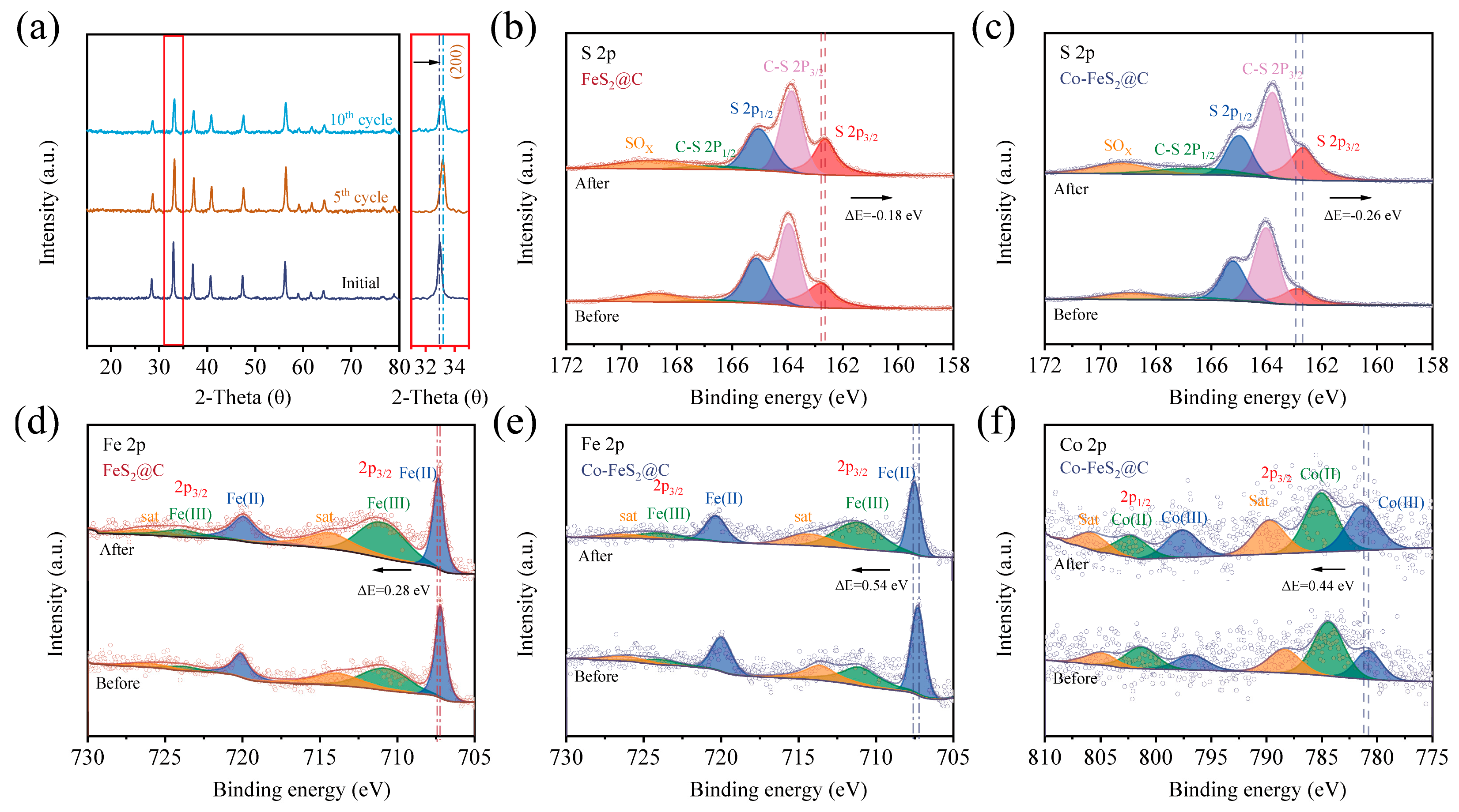 - Men, X.; Deng, T.; Chen, L.; Che, J.; Wang, J.; Wang, J. Suppressing Surface Oxidation of Pyrite FeS2 by Cobalt Doping in Lithium Sulfur Batteries. Small 2024, 20, e2403576. [Google Scholar] [CrossRef]