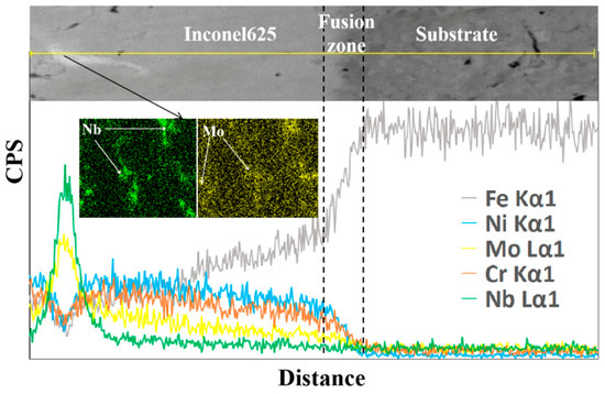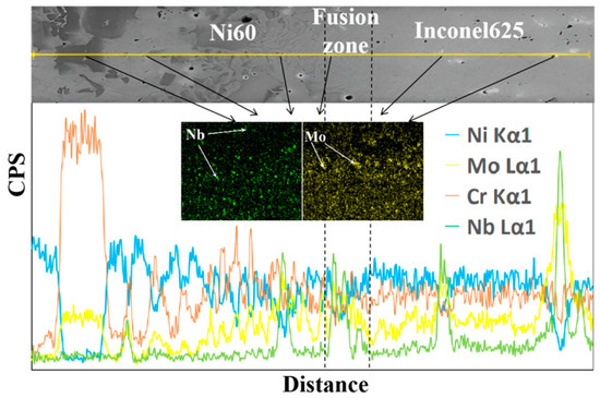 Figure 4 shows the elemental analysis of the Inconel625-Ni60 interface of the laminated structure. Via observation, it can be found that there are many fine white phases distributed throughout the interface. The positions of these phases all show the aggregation of Nb or Mo elements. In particular, there are two areas in the fusion line area where Nb and Mo elements are aggregated, while Cr and Ni elements are reduced. This phenomenon shows that Nb-Mo synergistically segregates in the fusion line area to form a nanoscale Laves phase, which can not only inhibit the formation and aggregation growth of carbides, thereby achieving the grain refinement effect, but also form pinning dislocations, causing the crack propagation path to deflect and reducing crack generation [26].