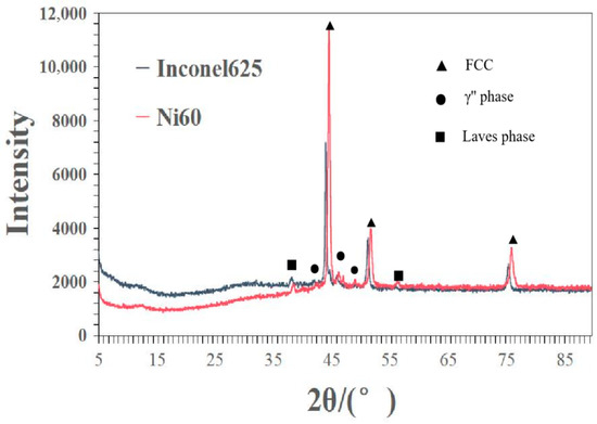 To further verify the crack arrest effect of the FeMnNiSi-Inconel625-Ni60 laminated structure, diffraction pattern analysis of the laminated structure was carried out. The black broken line in Figure 5 is the XRD diffraction pattern of the Inconel625 cladding layer, and the red broken line is the XRD diffraction pattern of the Ni60 cladding layer. The two samples are the transition layer and the surface cladding layer of the laminated structure cladding layer, respectively. The characteristic peak positions of the FCC phase of the Inconel625 cladding layer are at 44.2°, 51.5° and 75.7°, the diffraction peaks of the Laves phase are at 38.3°and 56.2°, and the diffraction peaks of the γ″ phase are at 42.1° and 46.1°. The characteristic peak positions of the FCC phase of the Ni60 cladding layer are at 44.8°, 52°, and 76.2°.