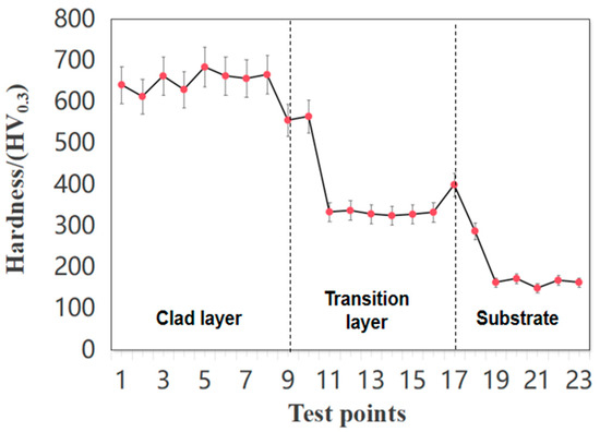 Regarding the microhardness measurement of the FeMnNiSi-Inconel625-Ni60 laminated structure cross-section, microhardness measurements were performed along a horizontal cross-section of the cladding layer, with test points spaced at 200 μm intervals from the cladding surface to the substrate. The average microhardness values (HV0.3) reveal a distinct gradient: the substrate (FeMnNiSi) exhibits a hardness of 165.22 HV0.3, while the intermediate Inconel 625 cladding layer reaches 340.71 HV0.3 (2.06× the substrate). The surface Ni60 layer achieves the highest hardness at 641.31 HV0.3 (3.88× the substrate), as shown in Figure 6. This progressive increase in hardness—from substrate to surface—suggests that the Inconel625 layer acts as an effective buffer, mitigating stress concentrations between the softer substrate and the harder Ni60 surface layer. Such a graded hardness profile is likely to enhance the mechanical integrity and wear resistance of the laminated structure. Sainath Krishna Mani Iyer found in the study of SS316L/Inconel625-based composite functional gradient coatings that the transition of the intermediate layer reduces interfacial stress concentration by more than 40%, providing theoretical support for this study [27]. During data recording, we also discovered that the hardness values of one area between the different cladding layers differed, as did the hardness of the two layers. This phenomenon is primarily due to the significant differences in hardness between the different alloy materials. While the cladding retains its original properties, the laser heat input causes elemental migration. During the laser cladding process, some elements also generate new species, all of which lead to changes in hardness. Overall hardness analysis shows that the cladding layer in the FeMnNiSi-Inconel625-Ni60 stack is significantly harder than the substrate, achieving a surface strengthening effect.