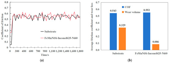 Friction coefficient curve of FeMnNiSi-Inconel625-Ni60 laminated structure cladding layer and substrate. (a) Friction coefficient curve. (b) Average friction coefficient and wear volume.