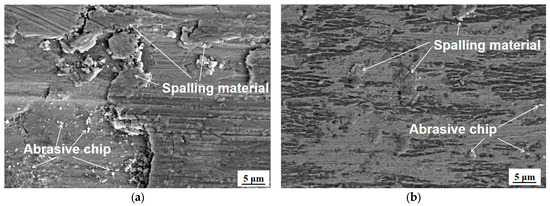 Scanning electron microscopy (SEM) examination of the wear scar morphology (Figure 9) reveals distinct wear mechanisms between the substrate and the laminated cladding layer. The substrate (Figure 9a) exhibits severe adhesive wear characteristics, including thick material peeling layers, deep grooves, and extensive material transfer, accompanied by abrasive wear due to large grinding debris accumulation. In contrast, the laminated cladding layer (Figure 9b) demonstrates primarily abrasive wear behavior, with fine grinding debris particles generated by the strengthening phase under grinding force, forming shallow grooves alongside the cutting action of silicon nitrideceramic balls. Minor adhesive wear features are observed, but no large-scale material peeling occurs [30].