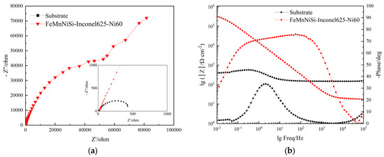 To elucidate the electrochemical corrosion behavior of the FeMnNiSi-Inconel625-Ni60 laminated cladding layer and its substrate, electrochemical impedance spectroscopy (EIS) analysis was conducted, as illustrated in Figure 11. Figure 11a presents the Nyquist plots for both the laminated cladding and the substrate, while Figure 11b shows the corresponding Bode diagrams.