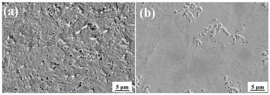 In comparing the specific data of the crystal plane diffraction peaks of the two cladding layers, it was found that the diffraction peaks of the FCC phase of the Inconel625 cladding layer shifted to the left. This is because the high content of Nb and Mo and other large-atomic-radius elements in Inconel625 replace the Ni lattice, resulting in the expansion of the γ-Ni lattice. According to the Bragg equation, 2d·sinθ = nλ, the increase in the interplanar spacing d will lead to a decrease in the diffraction angle θ, which is manifested as a left shift in the peak position. The presence of FCC phase in both cladding layers indicates that the cladding layers have good high-temperature stability, and the Cr element in the cladding layer can promote the formation of the passivation film and improve the corrosion resistance of the cladding layer in 3.5% NaCl solution [25]. The Laves phase acts as a pinning phase at the grain boundary to inhibit grain boundary sliding and maintain the stability of the structure under high-temperature conditions of laser cladding. Moreover, the preferential precipitation of the Laves phase can consume Nb, reduce the precipitation amount of NbC carbides, and reduce the peak strength of carbides [26]. The γ″ phase pins the grain boundary to hinder the continuous network precipitation of carbides, achieving a grain refinement effect and dominating the low-temperature strengthening. The synergistic effect of the two structures can improve the performance of the cladding layer and effectively inhibit the generation of cracks.