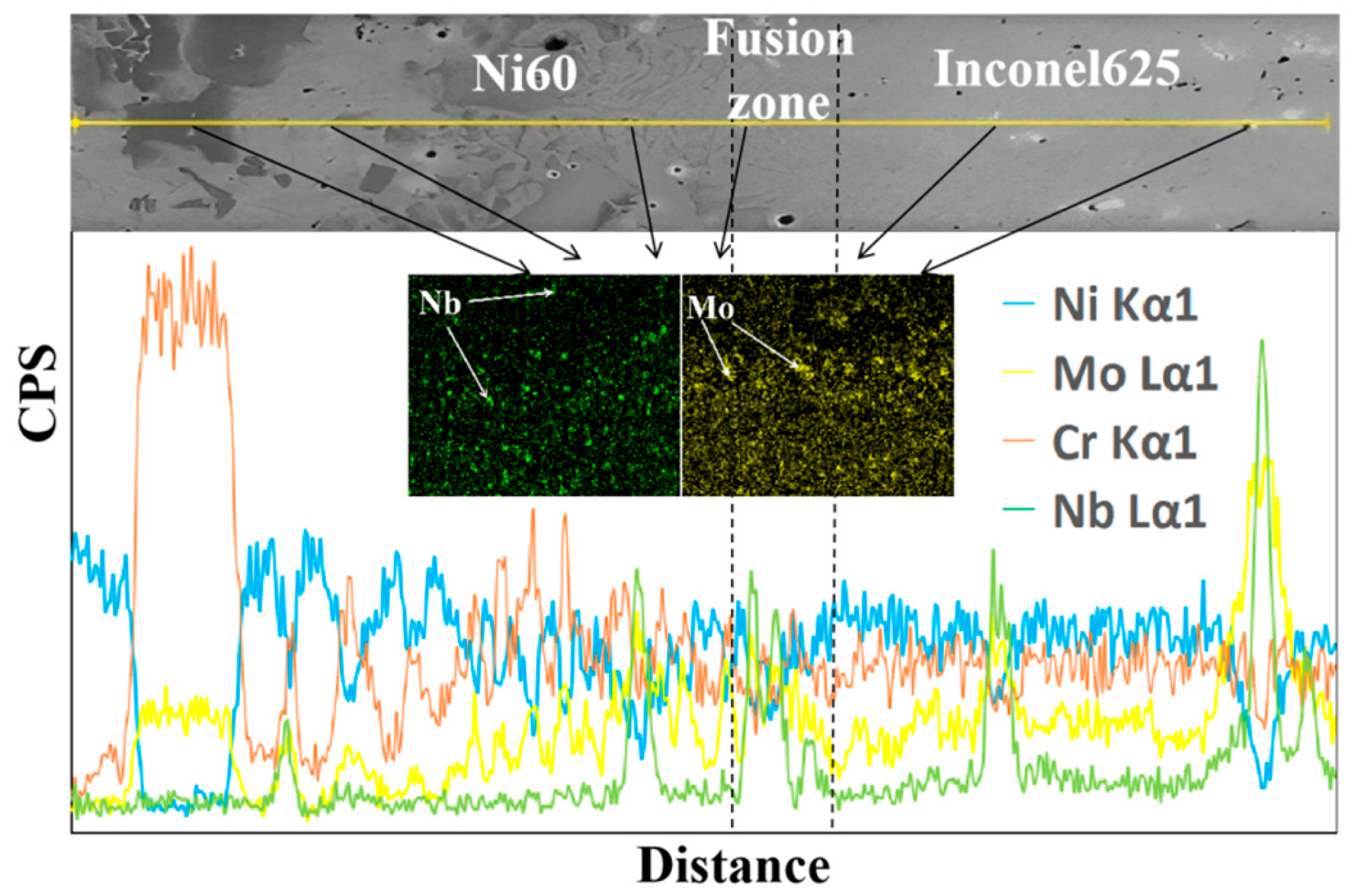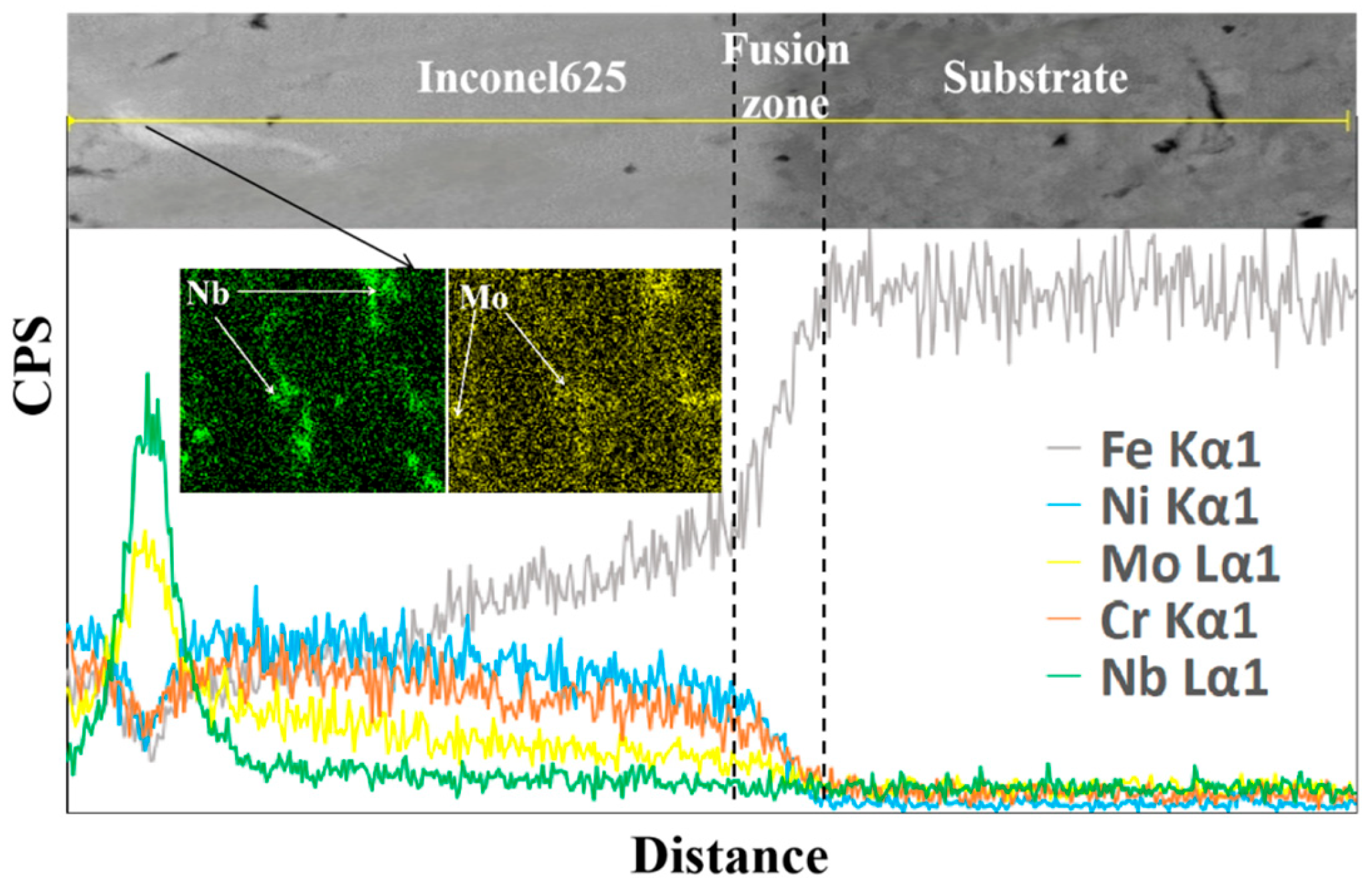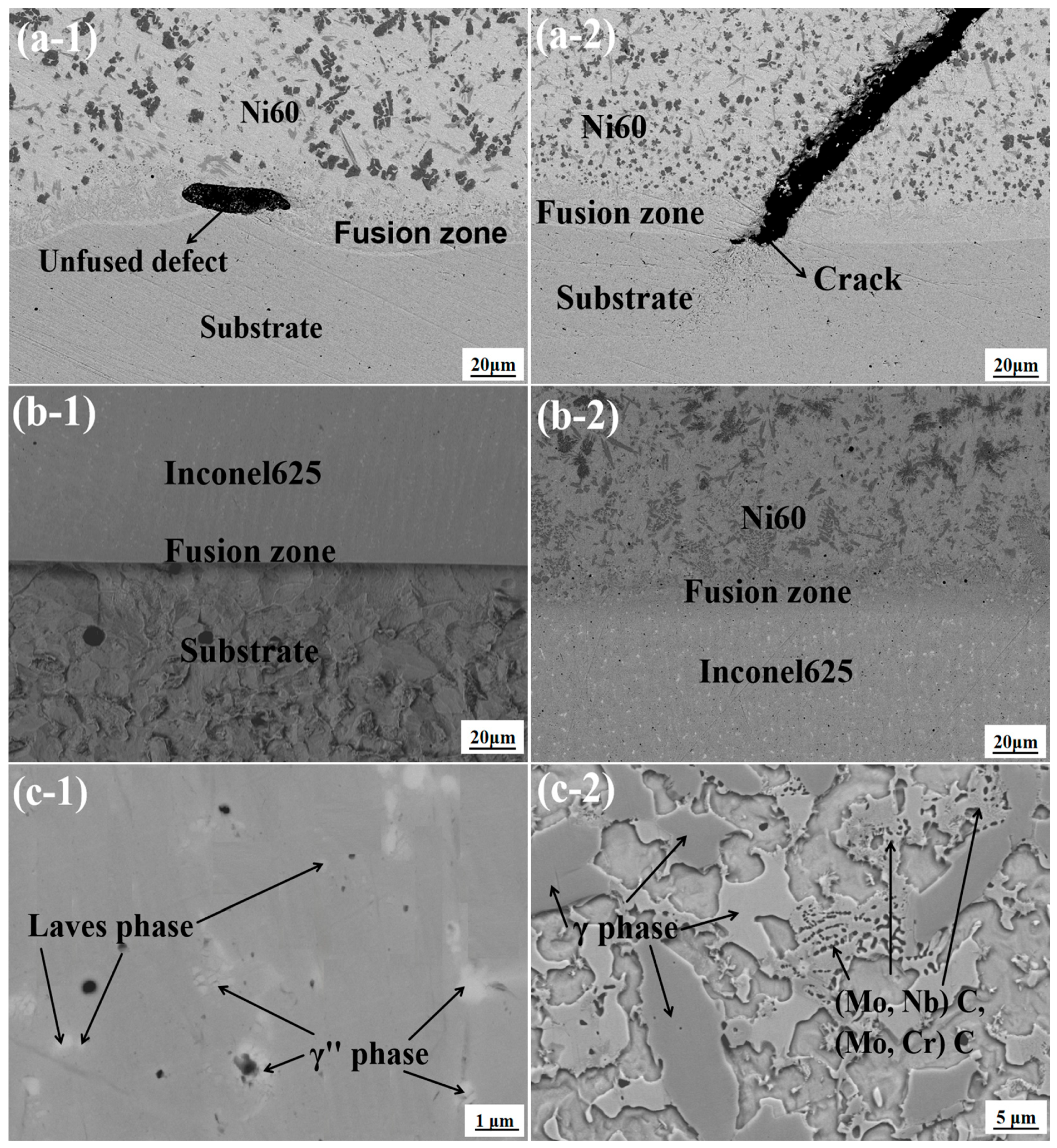 - By observing the micromorphology of the interface area between the Ni60 single cladding layer and the FeMnNiSi-Inconel625-Ni60 laminated structure, we found unfused defects and obvious cracks in the fusion zone of the single cladding layer, while there were no obvious cladding defects in the two cladding layer areas of the laminated structure.