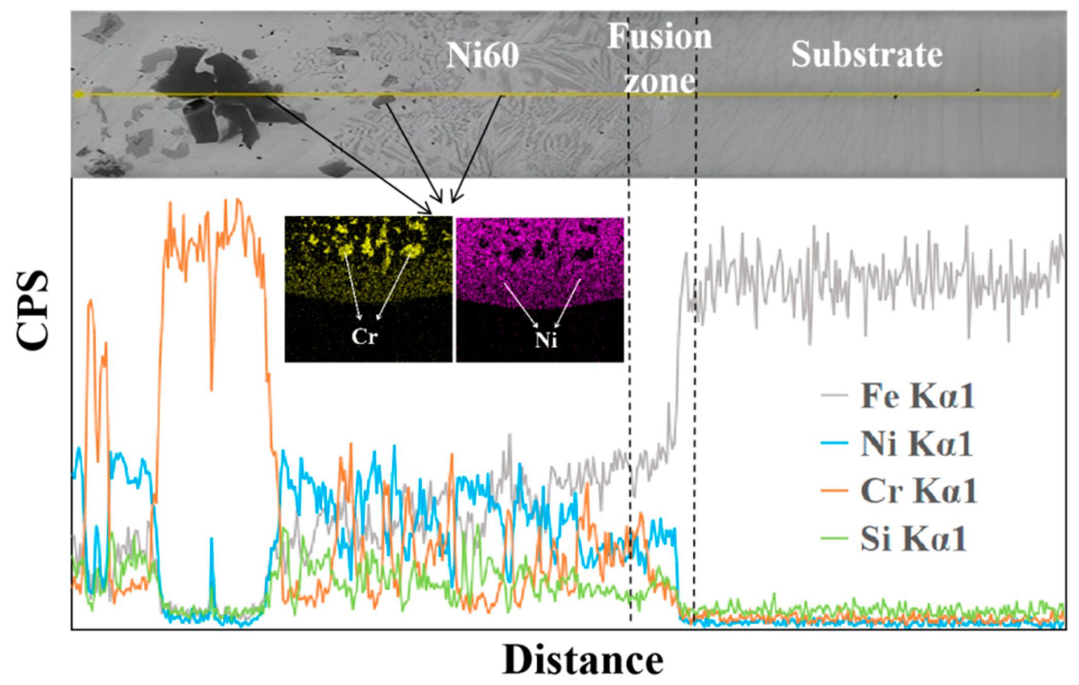 - Shen, X.; Chen, L.; Wu, Y.; Chen, C.; Zhang, X.; Zhou, W.; Ren, X. Effect of Substrate Material Properties on Microstructure and Mechanical Properties of Ni60 Coatings Prepared by Extreme High-Speed Laser Cladding. Steel Res. Int. 2024, 95, 2300531. [Google Scholar] [CrossRef]