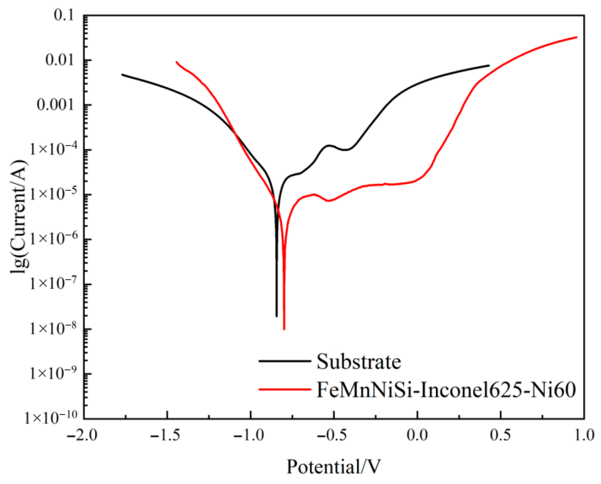 - The electrochemical corrosion test results indicate that under identical environmental conditions, the laminated structure cladding layer exhibits superior corrosion resistance compared to the substrate. Specifically, the cladding layer demonstrates a higher self-corrosion potential (−0.780 V vs. −0.844 V for the substrate), a lower corrosion current density (8.32 × 10−6 A/cm2 vs. 6.546 × 10−5 A/cm2), and a significantly higher polarization resistance (8623.6 Ω vs. 2426.9 Ω). Additionally, the frequency-stable region width at the highest impedance modulus |Z| is notably wider for the cladding layer, and its corrosion rate is 71.86% slower than that of the substrate. These findings confirm that the laminated structure has a slow corrosion rate, minimal corrosion tendency, and excellent overall corrosion resistance.