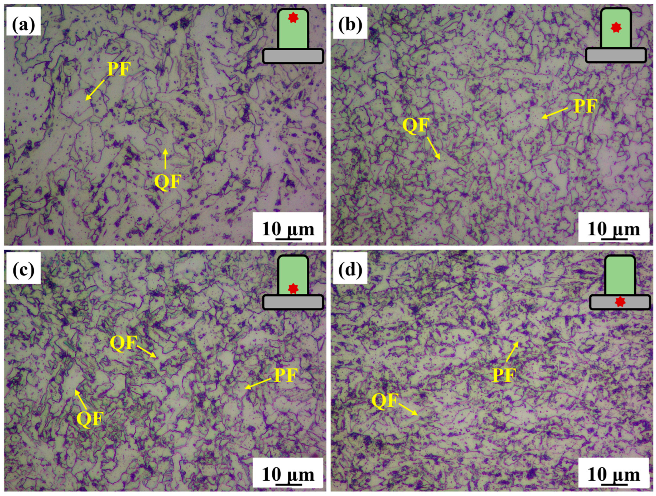 - The microstructure exhibited inhomogeneity along the building direction. From the bottom to the top, the grains gradually coarsened, and the proportion of PF increased. From the bottom to the top, thermal accumulation increased, resulting in decreased cooling rates, which promoted grain coarsening and the formation of PF. The grain size of the AM X70 was larger than that of BM.