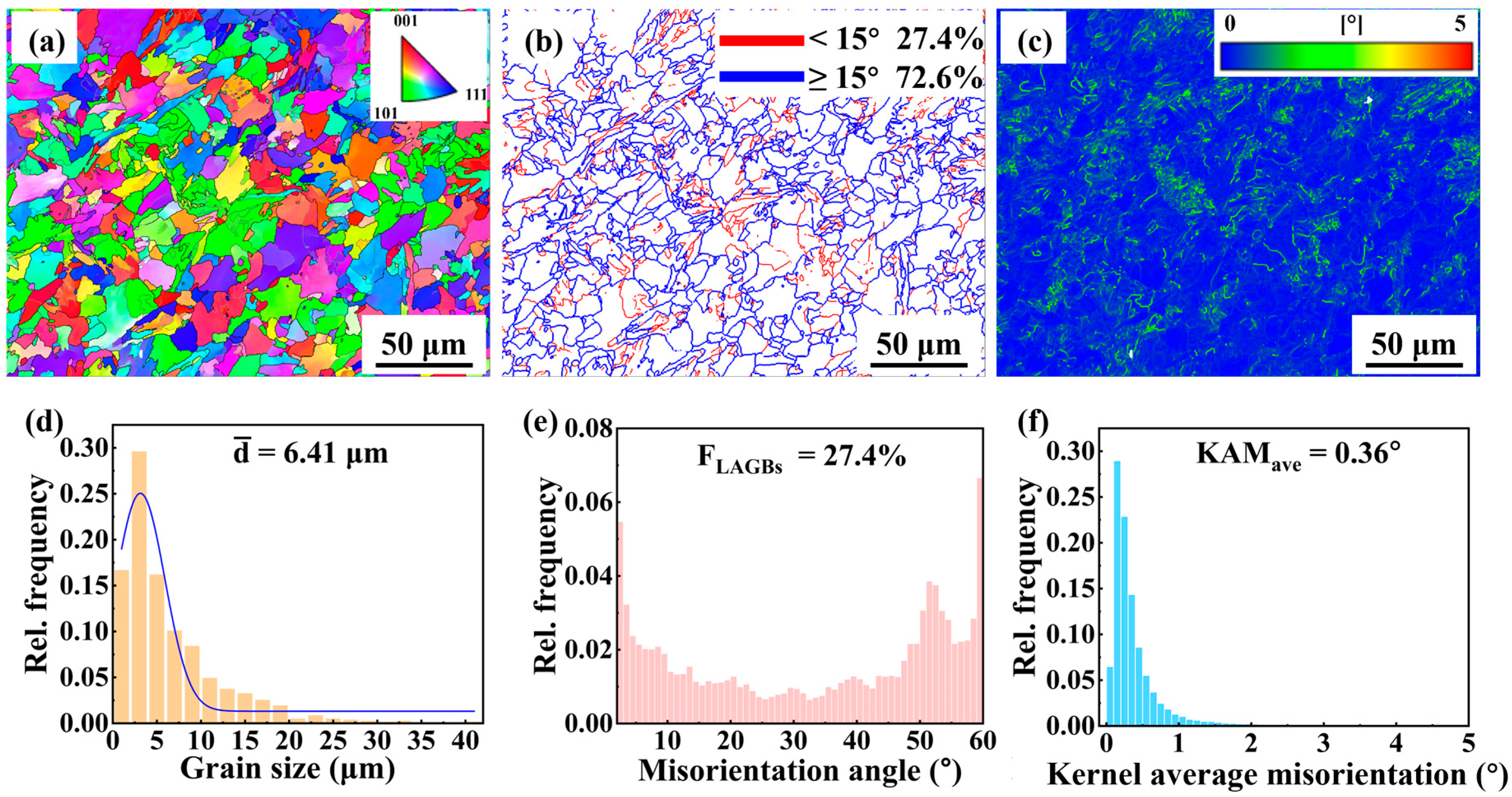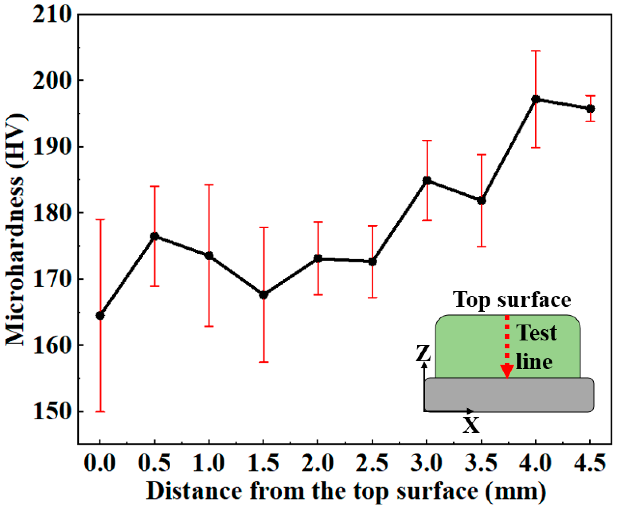 - The microhardness gradually decreased along the building direction. The bottom region had a high content of QF, resulting in higher microhardness. In contrast, the top region was predominantly composed of coarse PF, leading to lower microhardness. The average microhardness of the AM specimen was 179 ± 11 HV which was 23.8% lower than that of the BM specimen (235 ± 7 HV).