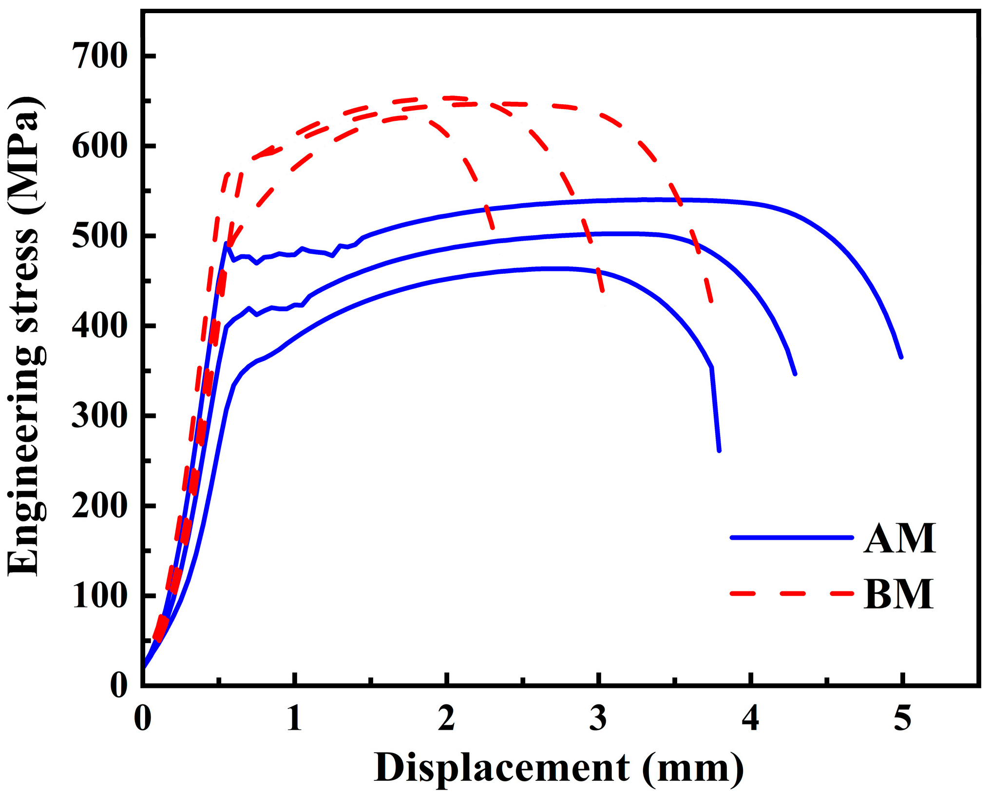 - The AM X70 exhibited a YS of 435 MPa and an UTS of 513 MPa. Both the YS and UTS of the AM X70 were lower than those of the BM and API 5L standard. The elongation of AM X70 reached 42.9%, which was 58% higher than that of the BM. The reduction in strength stemmed from the grain coarsening and decreased dislocation density induced by the L-DED thermal cycles. Meanwhile, the plastic accommodation ability was enhanced, resulting in substantially improved ductility. In harsh service environments characterized by complex stress states, the strength of repaired pipeline steel becomes critically important. Given the current limitations in mechanical performance, future work will primarily focus on enhancing the strength of the deposited X70 steel.
