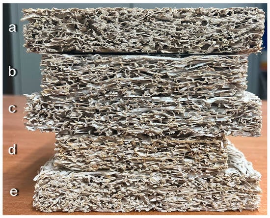 Cross-sections of the wood wool samples: (a) MOCB, bulk density: 380.5 kg/m3; (b) CACB, bulk density: 430.6 kg/m3; (c) CACB, bulk density: 380.3 kg/m3; (d) ASB, bulk density: 428.5 kg/m3; (e) WPC, bulk density: 495.5 kg/m3.