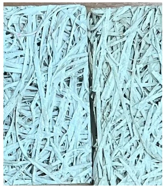 The formed wood wool boards are left to cure under controlled temperatures and humidity, allowing the binder to hydrate and develop strength. CAC-based boards cure rapidly, reducing processing time, whereas GCP systems require monitoring to ensure dimensional stability. Typical curing regimes balance initial strength gains (primarily from gypsum or calcium aluminate cement) with long-term strength improvements due to pozzolans. The samples were demoulded after 24 h and then cured under film coverage (Figure 1b) for 7 days.
