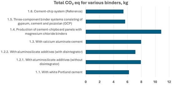 CAC-based panels generate 7.94 kg CO2 eq./m2, the highest among PC-based systems, reflecting the specialised production requirements for this high-performance binder. While offering superior fire resistance and durability, the environmental cost raises questions about cost–benefit optimisation in standard applications (Figure 4).