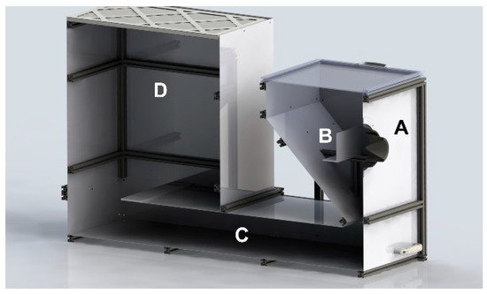 Powder recovery during cold spray is uncommon in a R&D environment due to several challenges: (1) direct recovery from the dust collector is neither simple nor efficient; (2) contamination from other powders and materials may occur; and (3) handling fine metallic particles poses explosion hazards. Previous studies have recovered powder by lining the cold spray chamber with aluminum foil [11] or using a custom powder reclamation chamber [9]. An approach similar to the latter was adopted in this work: a custom recovery chamber was designed and assembled, as illustrated in Figure 1, using extruded aluminum profiles and galvanized mild steel plates. The chamber consists of four zones: A—cold spray gun entrance, B—substrate holder area, C—gas deceleration area, and D—the exit chimney and filter. Deposition occurs in zone B, where the substrate is positioned perpendicular to the gun’s main spray axis. The back wall is placed more than 10 cm behind the substrate and angled to minimize unwanted deposition.