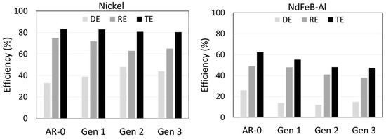 The results for Ni and NdFeB-Al recovered powders are presented in Figure 2. For Ni, the as-received powder (AR-0) had a DE of 33%, which increased to 48% for Generation 2 before slightly decreasing to 44% for Generation 3. The RE for Ni was initially close to 75%, decreasing to ≈ 65% for Generations 2 and 3. The TE remained relatively stable, from 83% (AR-0) to 80% (Generation 3).
