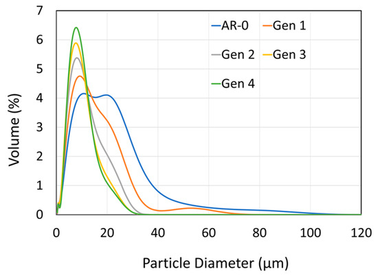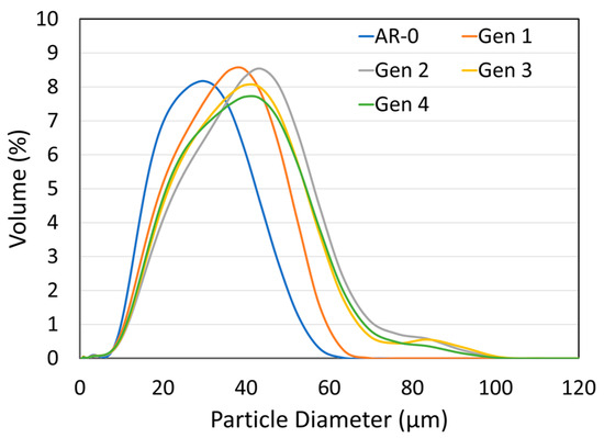 NdFeB-Al composite particle size distribution for as-mixed powder (AR-0) and recovered powders (Generations 1 to 4).