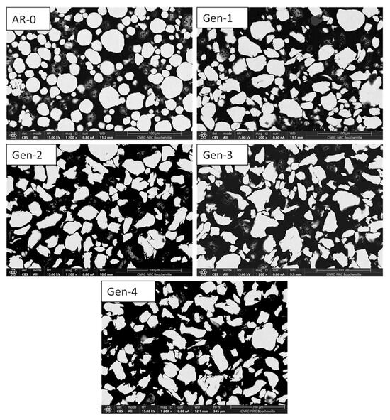 SEM cross-sections images of NdFeB-Al powder for as-mixed powder (AR-0) and recovered powders (Generations 2 and 4).