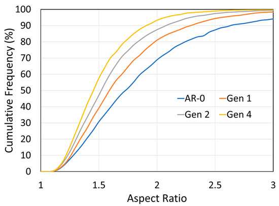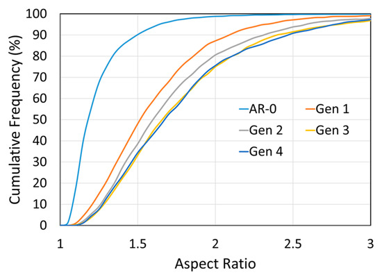 Effect of spray-recovery cycles on NdFeB-Al particles’ aspect ratio for as-mixed powder (AR-0) and recovered powders (Generations 1,2 and 4). The particles’ aspect ratio is increasing with each spray-recovery cycle.