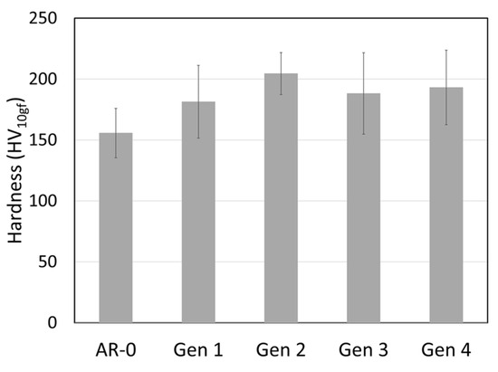 Recovered Ni powders were also characterized for density and hardness (Figure 6 and Figure 7). Powder density decreases slightly with the number of cycles, while the hardness increases significantly from just above 150 HV for AR-0 to nearly 200 HV for Generations 2 to 4.