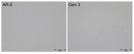 Coatings produced from all generations reached thicknesses of up to 13 mm without delamination. All coatings were dense, with no visual differences in color or surface roughness between generations. Metallography observations (Figure 8) show that coatings from AR-0 and Generation 3 powders are nearly identical, with minimal porosity and no significant defects. Coatings from Generations 1 and 2 displayed similar microstructures.