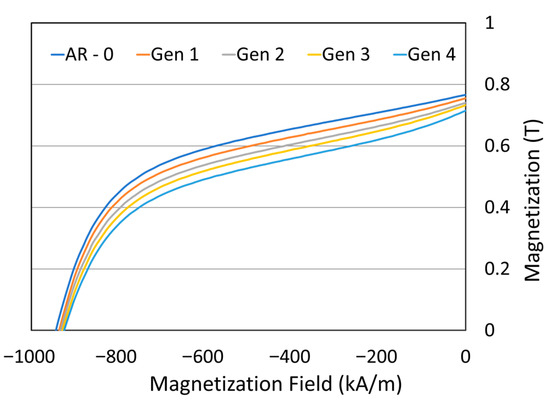 Magnetic properties of the powders are shown in Figure 14. The second quadrant of the demagnetization curve is presented, where the magnetic induction at zero field corresponds to the remanence, and the x-axis intercept corresponds to the coercivity. Both remanence and coercivity show a slight decline with increasing generations, with the remanence decrease being more pronounced. Table 5 summarizes the magnetic properties as well as densities of the magnets produced with powders of different generations. Remanence decreases progressively with generation number.