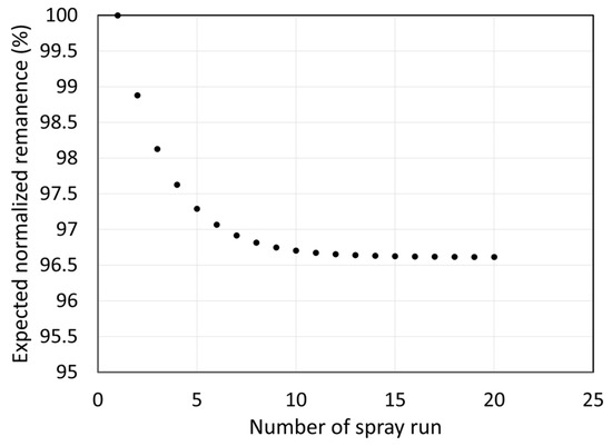 Expected normalized remanence of the powder used for a large number of sprays in a production scenario. The powder used from each spray run is obtained from a mix of recovered powder from the previous run and the addition of as-received powder.