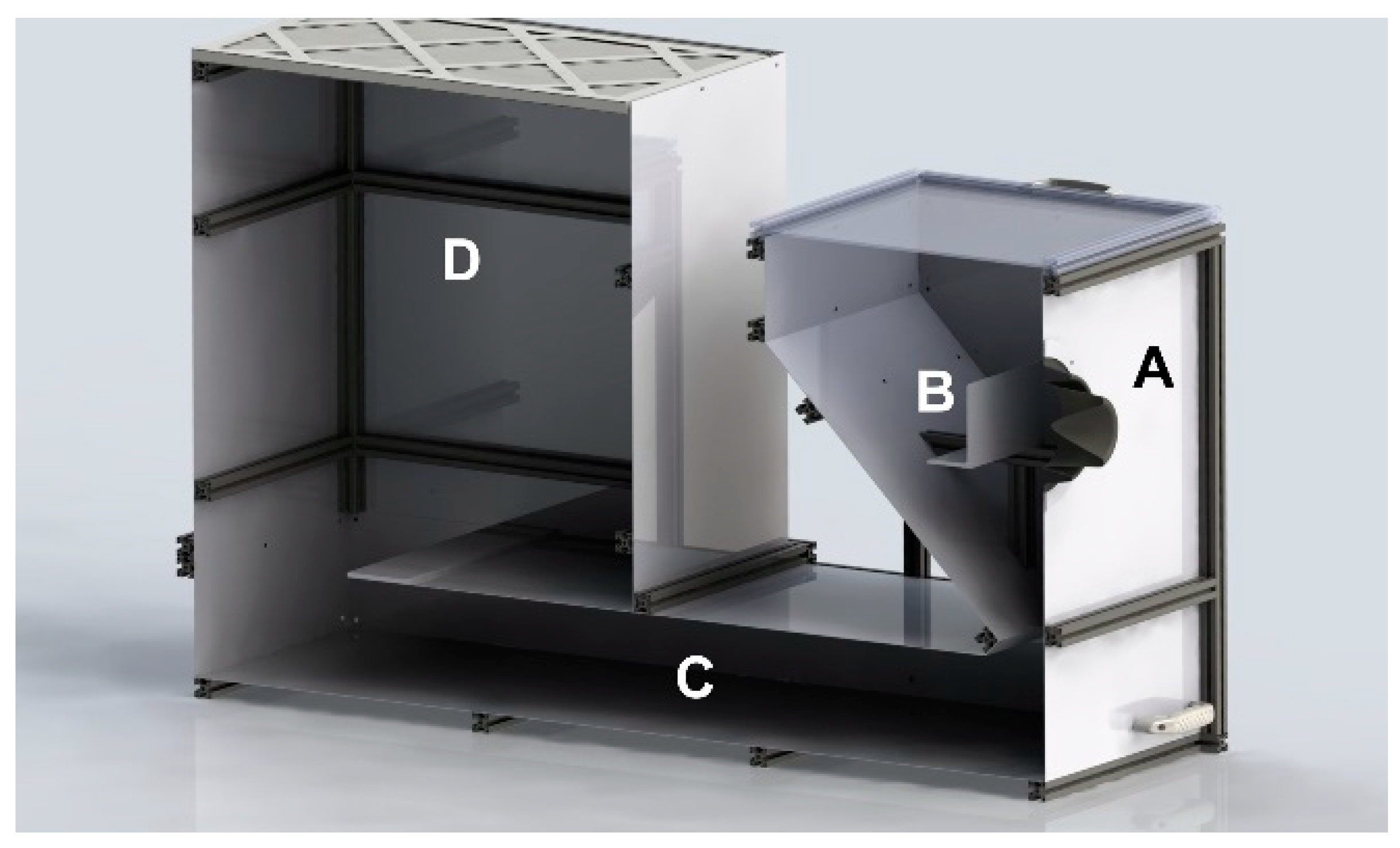 Figure 1, using extruded aluminum profiles and galvanized mild steel plates. The chamber consists of four zones: A—cold spray gun entrance, B—substrate holder area, C—gas deceleration area, and D—the exit chimney and filter. Deposition occurs in zone B, where the substrate is positioned perpendicular to the gun’s main spray axis. The back wall is placed more than 10 cm behind the substrate and angled to minimize unwanted deposition.