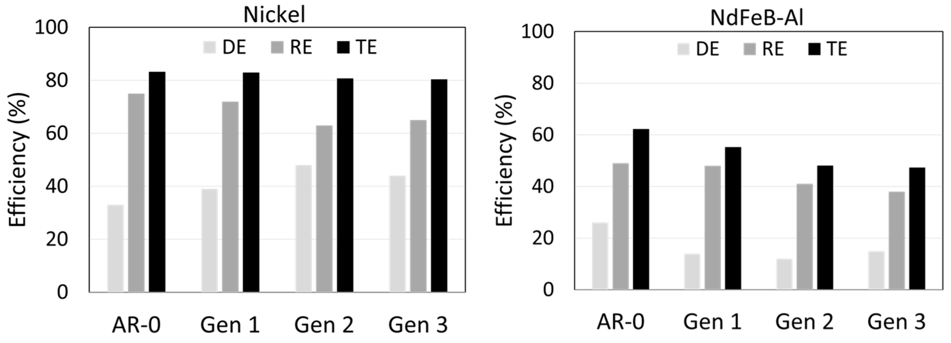 On the other hand, for NdFeB-Al, the AR-0 DE was 26%, dropping sharply to 14%, 12%, and 15% for Generations 1, 2, and 3, respectively. The RE was below 50% for AR-0 and declined to 38% by Generation 3. Consequently, the TE decreased from 62% (AR-0) to 47% (Generation 3). It is worth noting that producing enough Generation 4 powder for testing requires spraying a significant amount of AR-0 powder due to the system’s limited RE and the fraction of powder that is successfully deposited. This is particularly true for NdFeB-Al, where the RE is below 50%. Using the data in